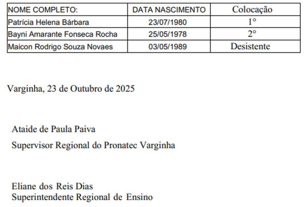 O Diretor da Superintendência Regional de Ensino de Varginha, no uso de suas atribuições legais, TORNA PÚBLICO O RESULTADO FINAL do Edital Pronatec 07/2025, para o cargo de PROFESSOR do Curso FIC Operador de Computador da EE NOSSA SENHORA APARECIDA, de Ilicínea, nos termos da planilha de informação conforme segue abaixo: